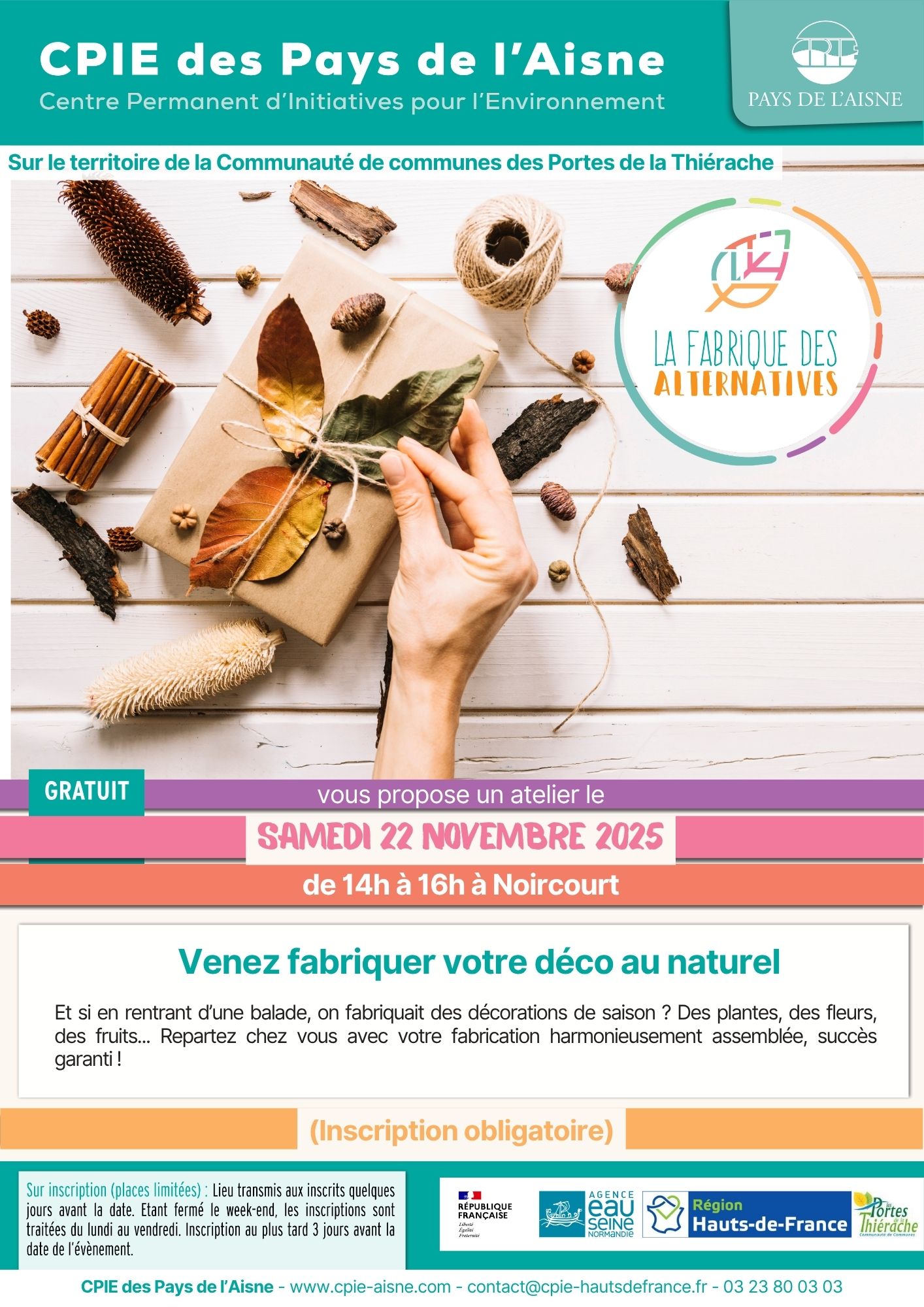 Atelier "Fabriquer votre déco au naturel !" SAMEDI 22 NOVEMBRE 2025 de 14h à 16h à Noircourt